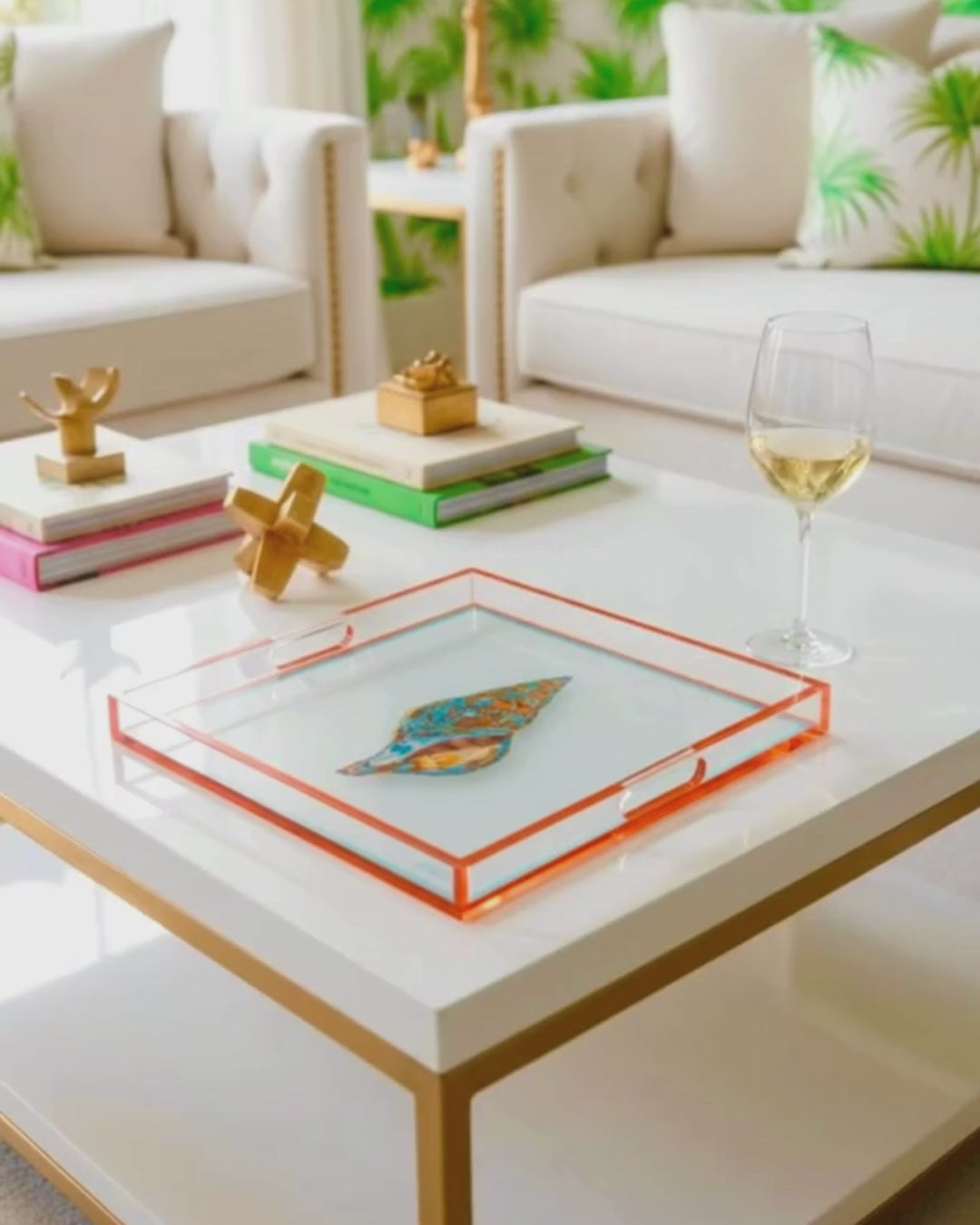 This tray showcases a beautifully detailed whelk shell framed in vivid orange and aqua tones. Combining coastal inspiration with modern elegance, it’s perfect for serving or as a decorative centerpiece. Add a stylish, nature-inspired accent to your home with this stunning acrylic tray. Available in Square (14” x 14” x 2”)