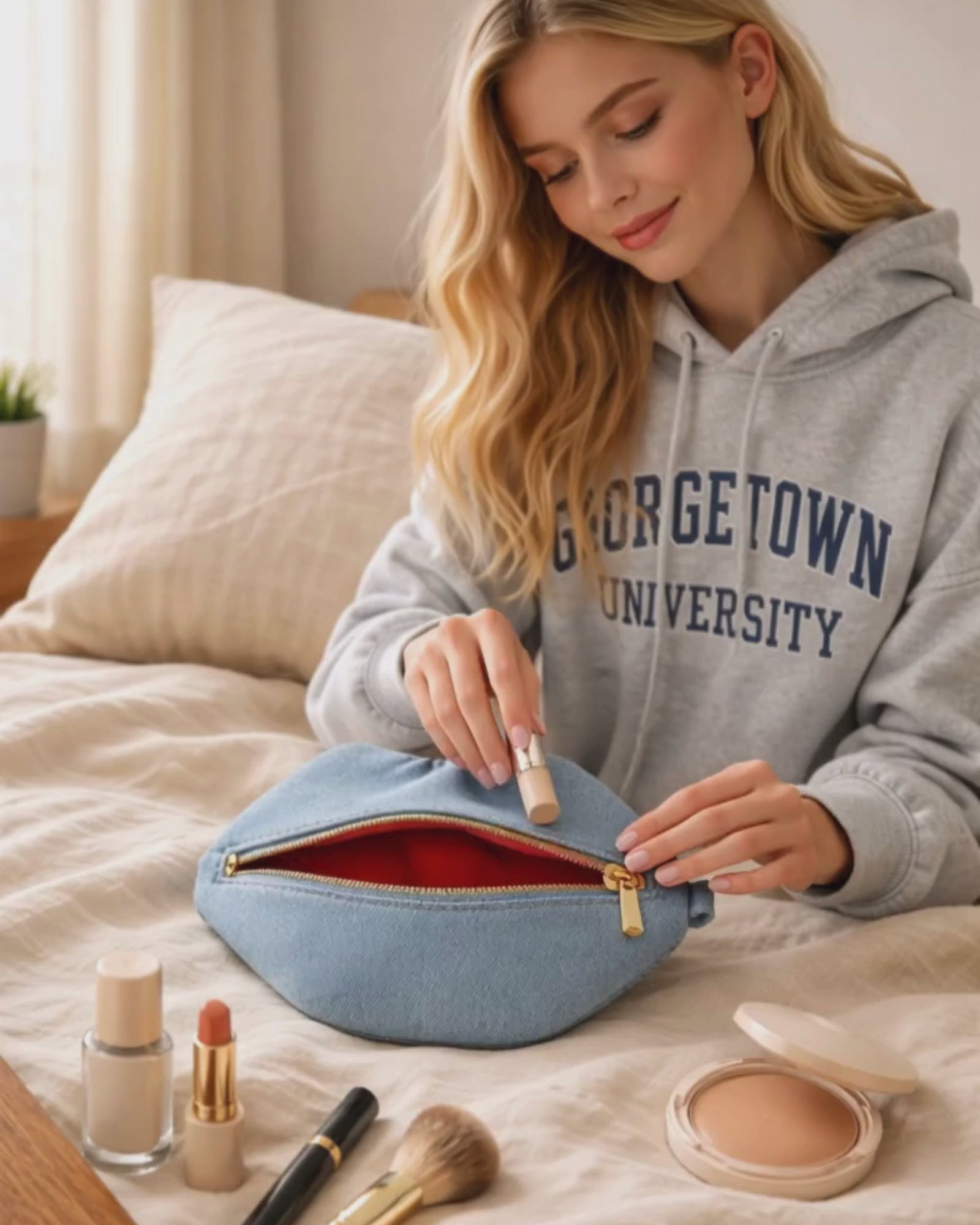 The Blake: Light Blu updates the classic cosmetic pouch with a fresh, easy denim finish. Its pale blue denim shellbrings a soft, relaxed mood that feels bright and modern on vanity shelves and in travel kits—like your favorite faded jeans, reimagined as a sculptural accessory. Lined in red satin and finished with gold-tone hardware, this 10.0" × 7" × 0.5" pouch keeps lip colors, brushes, and travel-size skincare organized and protected. It also includes a removable wrist strap with a clip-on clasp for versatile, elevated styling and effortless carrying. Light Wash pairs beautifully with white cotton, layered gold jewelry, raffia totes, and minimalist handbags.